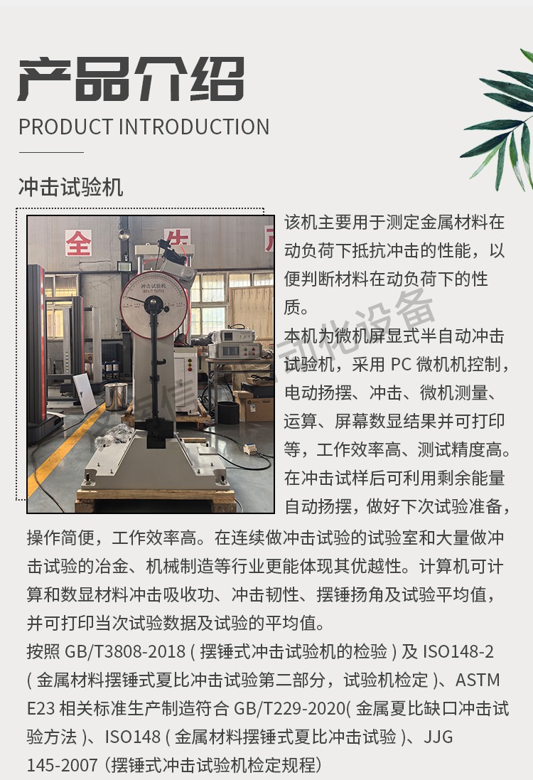本機(jī)為微機(jī)屏顯式半自動沖擊試驗(yàn)機(jī),采用PC微機(jī)機(jī)控制,電動揚(yáng)擺、沖擊、微機(jī)測量、運(yùn)算、屏幕數(shù)顯結(jié)果并可打印等,工作效率高、測試精度高。在沖擊試樣后可利用剩余能量自動揚(yáng)擺,做好下次試驗(yàn)準(zhǔn)備,操作簡便,工作效率高。在連續(xù)做沖擊試驗(yàn)的試驗(yàn)室和大量做沖擊試驗(yàn)的冶金、機(jī)械制造等行業(yè)更能體現(xiàn)其優(yōu)越性。計算機(jī)可計算和數(shù)顯材料沖擊吸收功、沖擊韌性、擺錘揚(yáng)角及試驗(yàn)平均值,并可打印當(dāng)次試驗(yàn)數(shù)據(jù)及試驗(yàn)的平均值。 按照 GB/T3808-2018 (擺錘式?jīng)_擊試驗(yàn)機(jī)的檢驗(yàn))及 ISO148-2(金屬材料擺錘式夏比沖擊試驗(yàn)第二部分,試驗(yàn)機(jī)檢定)、ASTM E23 相關(guān)標(biāo)準(zhǔn)生產(chǎn)制造符合 GB/T229-2020(金屬夏比缺口沖擊試驗(yàn)方法)、ISO148 (金屬材料擺錘式夏比沖擊試驗(yàn))、JJG 145-2007 (擺錘式?jīng)_擊試驗(yàn)機(jī)檢定規(guī)程) 四、主要技術(shù)指標(biāo): 1、沖擊能量:150J、300J 2、擺錘預(yù)揚(yáng)角:150° 3、擺軸中心至沖擊點(diǎn)距離:750mm 4、沖擊速度:5.2m/s 5、試樣支座跨距:40mm 6、鉗口圓角:R1-1.5mm 7、沖擊刀刃圓角:R2-2.5mm 8、沖擊刀厚度:16mm 9、角度準(zhǔn)確度:±0.1° 10、試樣尺寸:10×10×55mm 11、外形尺寸:2124 mm×600 mm×1340 mm 12、試驗(yàn)機(jī)凈重:450Kg 13、電源:交流三相 380V±10% 50HZ 5A 14、環(huán)境條件:周圍環(huán)境中無腐蝕介質(zhì),無震動,無強(qiáng)電磁場干擾。 五、設(shè)備主要配置: 1、300焦耳主機(jī)一臺; 2、150J、300J 擺錘各一個 3、取擺傳動裝置一套(裝在主機(jī)上) 4、自動掛擺裝置一套(裝在主機(jī)上) 5、保險機(jī)構(gòu)一套(裝在主機(jī)上) 6、安全防護(hù)裝置一套 7、擺錘拆卸器一只 8、支座調(diào)校器一只 9、試樣對中器一只 10、聯(lián)想打印機(jī)一套 專用測量軟件一套
