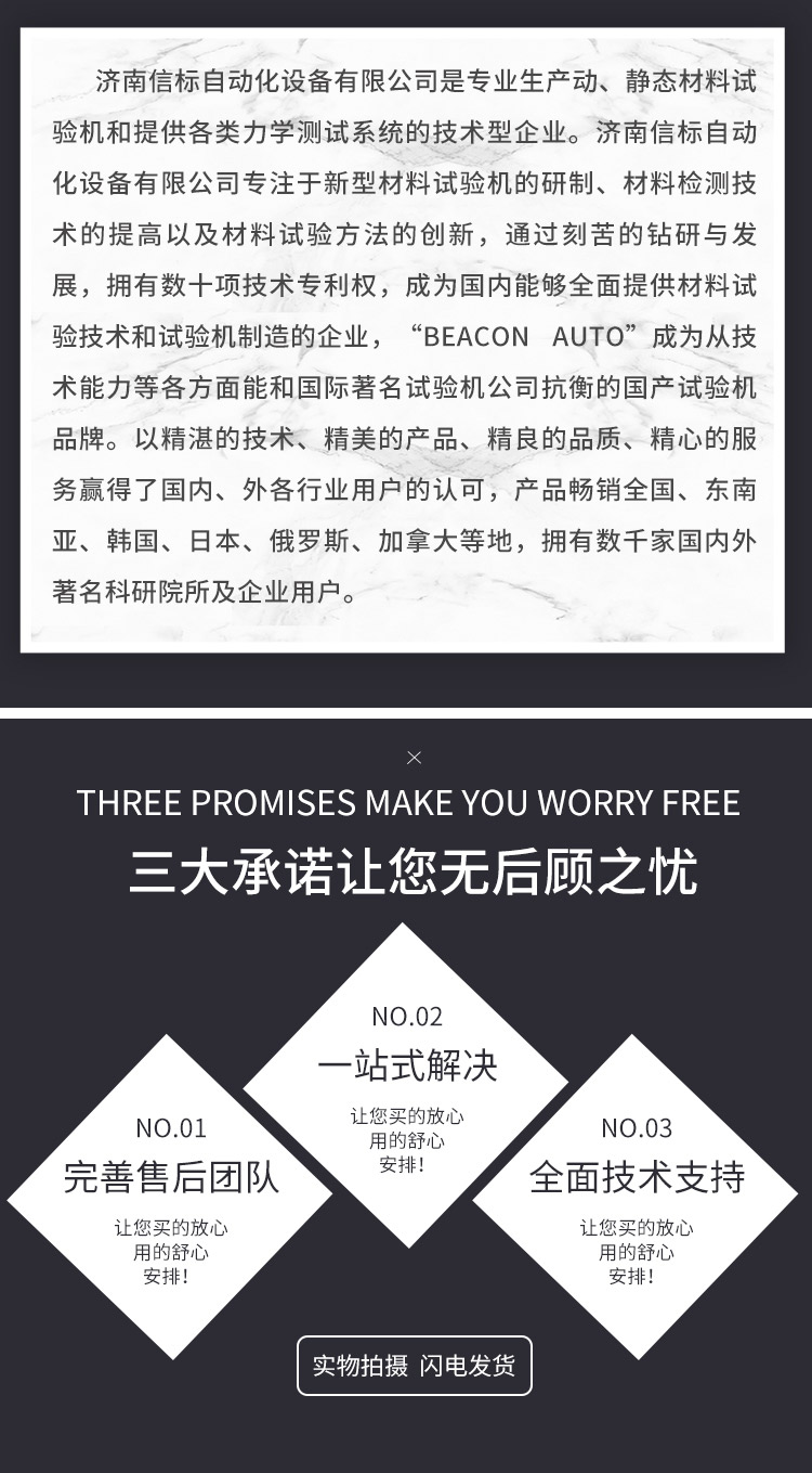 濟南信標自動化設備有限公司主要生產:動靜態萬能疲勞試驗機,接骨板彎曲試驗機,縫合線拉伸疲勞試驗機,髖膝關節磨損試驗機,電子萬能試驗機、液壓萬能試驗機、巖石三軸、四軸,電液拉力試驗機,材料試驗機,高低溫蠕變,高低頻疲勞,拉伸、扭轉、杯突等二十多個系列兩千多個的品種。
