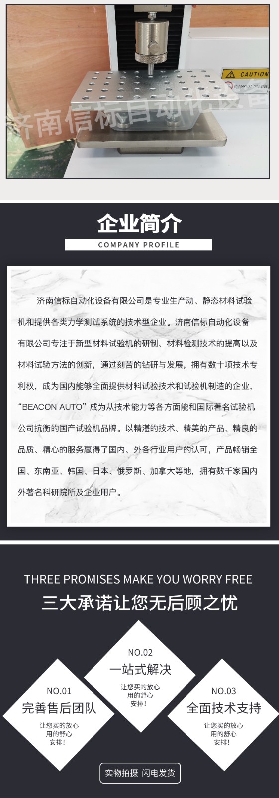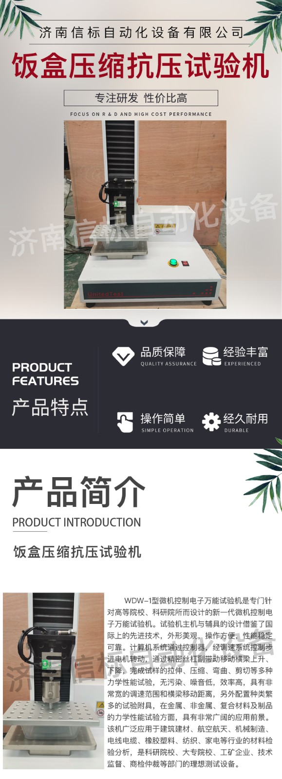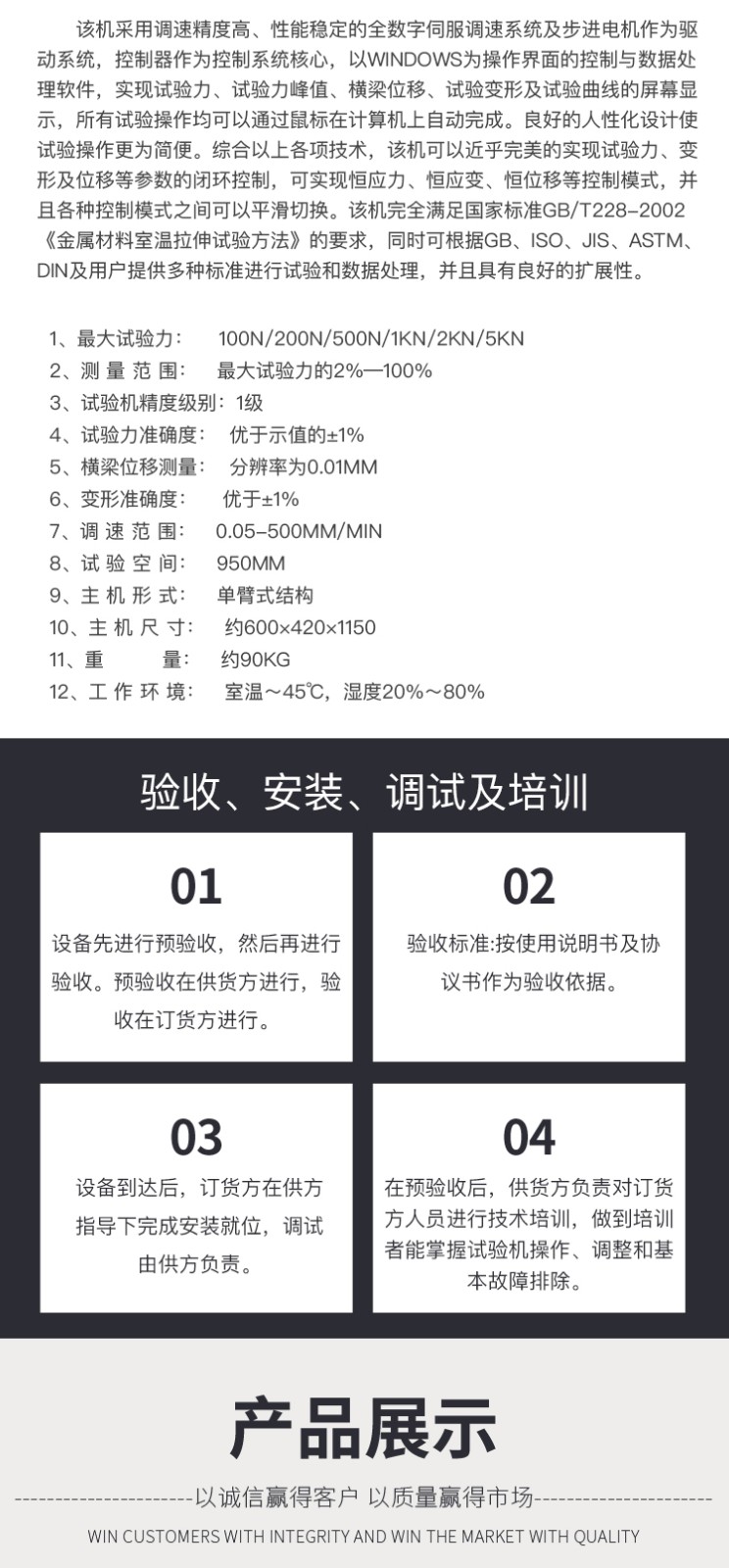 飯盒壓縮抗壓試驗機 單臂壓力萬能試驗機主要技術(shù)指標: 1、 最大試驗力: 100N/200N/500N/1KN/2KN/5KN 2、 測 量 范 圍: 最大試驗力的2%—100% 3、 試驗機精度級別:1級 4、 試驗力準確度: 優(yōu)于示值的±1% 5、 橫梁位移測量: 分辨率為0.01mm 6、 變形準確度: 優(yōu)于±1% 7、 調(diào) 速 范 圍: 0.05-500mm/min 8、 試 驗 空 間: 950mm 9、 主 機 形 式: 單臂式結(jié)構(gòu) 10、 主 機 尺 寸: 約600×420×1150 11、 重 量: 約90Kg 12、 工 作 環(huán) 境: 室溫~45℃,濕度20%~80% 飯盒壓縮抗壓試驗機 單臂壓力萬能試驗機主要功能及特點: 主機: 1.1調(diào)速系統(tǒng)采用伺服電機和自主研發(fā)減速系統(tǒng),性能穩(wěn)定可靠,具有過流、過壓、過載等保護裝置。調(diào)速范圍可達0.05~500mm/min。 1.2傳動部分采用圓弧同步齒形帶,精密絲杠副傳動,傳動平穩(wěn),噪音低,傳動效率高。 1.3萬向節(jié)采用十字插銷結(jié)構(gòu),而且具有擺角限制功能,一方面便于試樣夾持,保證試驗同心度,另一方面很好的消除了不規(guī)則試樣對傳感器的影響。 2、控制系統(tǒng)、操作軟件及數(shù)據(jù)處理系統(tǒng) 2.1計算機控制系統(tǒng),具有集成度高、性能穩(wěn)定、調(diào)整方便等優(yōu)點。可以對實驗數(shù)據(jù)進行實時采集,對實驗特性曲線實現(xiàn)實時動態(tài)顯示,試驗數(shù)據(jù)文件能以Access常用數(shù)據(jù)庫或SQLserve大型數(shù)據(jù)庫的方式保存,方便實現(xiàn)客戶的資源共享及網(wǎng)絡(luò)管理,以及用戶的再分析。對于用戶自定義的各種word2000報表,該軟件可輕松實現(xiàn)訪問,解決了不同用戶或同一用戶在不同時期對試驗報表有不同需要的難題。該軟件可處理試驗力、位移、 時間、變形的原始數(shù)據(jù)及由此派生的曲線。
