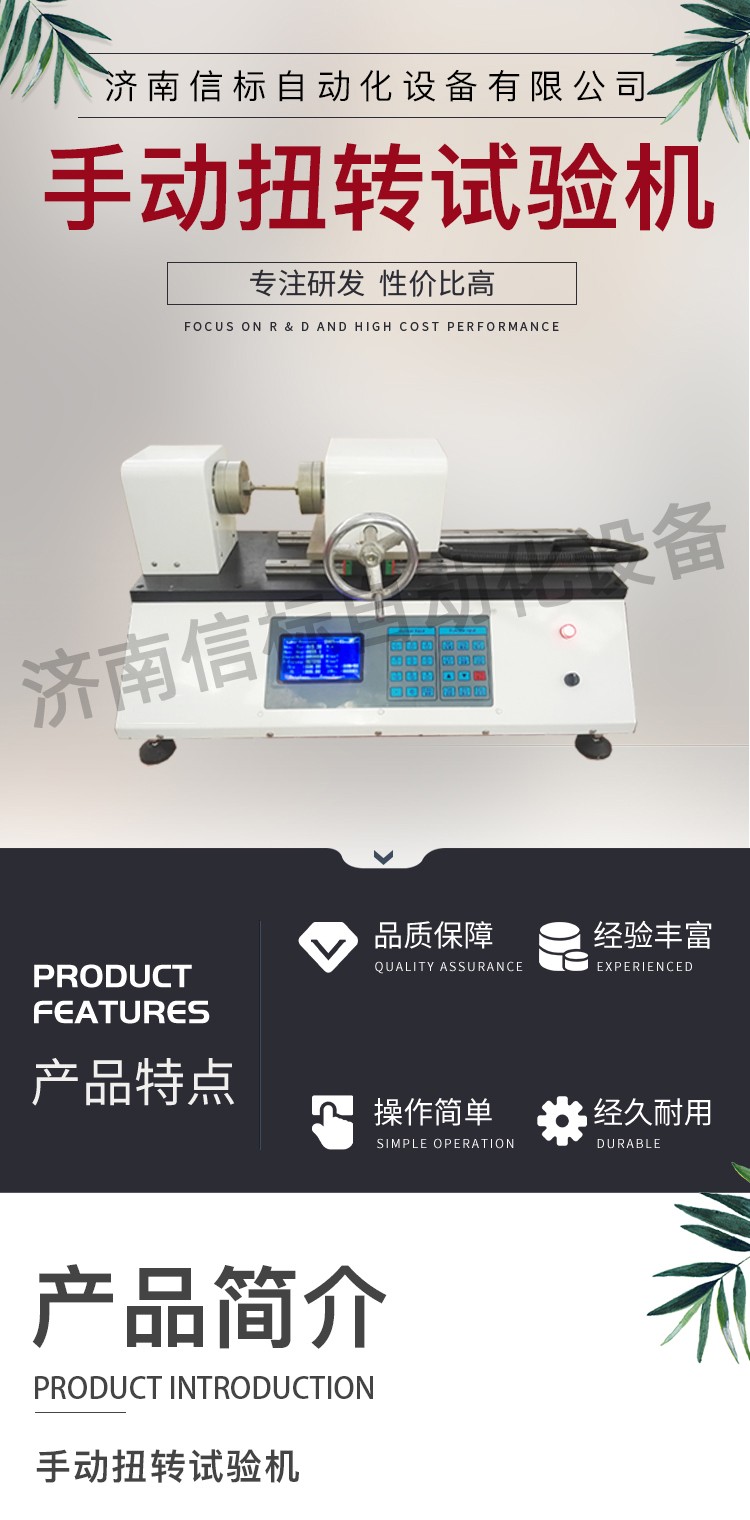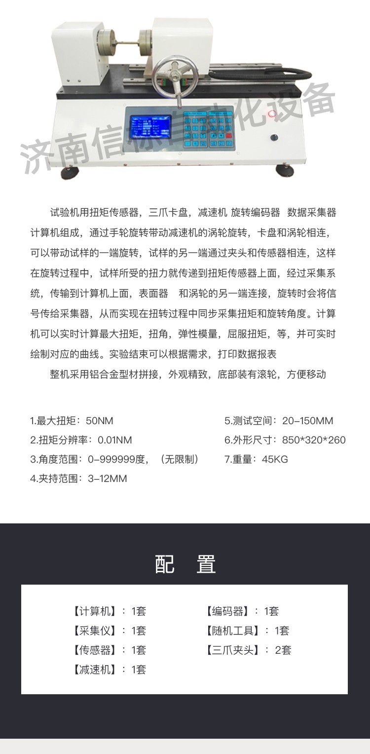 一、介紹 試驗(yàn)機(jī)用扭矩傳感器,三爪卡盤,減速機(jī) 旋轉(zhuǎn)編碼器 數(shù)據(jù)采集器 計(jì)算機(jī)組成,通過手輪旋轉(zhuǎn)帶動減速機(jī)的渦輪旋轉(zhuǎn),卡盤和渦輪相連,可以帶動試樣的一端旋轉(zhuǎn),試樣的另一端通過夾頭和傳感器相連,這樣在旋轉(zhuǎn)過程中,試樣所受的扭力就傳遞到扭矩傳感器上面,經(jīng)過采集系統(tǒng),傳輸?shù)接?jì)算機(jī)上面,表面器 和渦輪的另一端連接,旋轉(zhuǎn)時會將信號傳給采集器,從而實(shí)現(xiàn)在扭轉(zhuǎn)過程中同步采集扭矩和旋轉(zhuǎn)角度。計(jì)算機(jī)可以實(shí)時計(jì)算最大扭矩,扭角,彈性模量,屈服扭矩等,并可實(shí)時繪制對應(yīng)的曲線。實(shí)驗(yàn)結(jié)束可以根據(jù)需求,打印數(shù)據(jù)報表,整機(jī)采用鋁合金型材拼接,外觀精致,底部裝有滾輪,方便移動。試驗(yàn)機(jī)用扭矩傳感器,三爪卡盤,減速機(jī) 旋轉(zhuǎn)編碼器 數(shù)據(jù)采集器 計(jì)算機(jī)組成,通過手輪旋轉(zhuǎn)帶動減速機(jī)的渦輪旋轉(zhuǎn),卡盤和渦輪相連,可以帶動試樣的一端旋轉(zhuǎn),試樣的另一端通過夾頭和傳感器相連,這樣在旋轉(zhuǎn)過程中,試樣所受的扭力就傳遞到扭矩傳感器上面,經(jīng)過采集系統(tǒng)。 二、基本參數(shù) 1.最大扭矩:50NM 2.扭矩分辨率:0.01NM 3.角度范圍:0-999999度,(無限制) 4.夾持范圍:3-12mm 5.測試空間:20-150mm 6.外形尺寸:850*320*260 7.重量:45kg 三、配置: 1.計(jì)算機(jī):1套 2.采集儀:1套 3.傳感器:1套 4.減速機(jī):1套 5.編碼器:1套 6.隨機(jī)工具:1套 7.三爪夾頭:2套