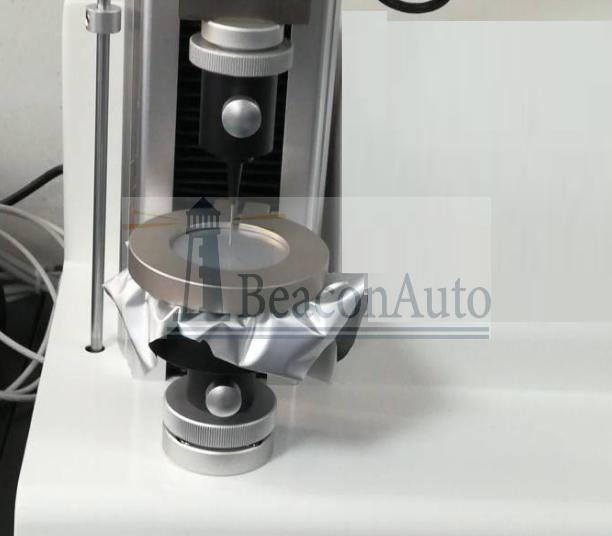 將直徑為100mm的試片安裝在樣膜固定夾環上,然后用直徑為1.0mm,球形頂端半徑為0.5mm的鋼針,以(50±5)mm/min的速度去頂刺,讀取鋼針穿透試片的大負荷,測試片數5個以上,取其平均值。